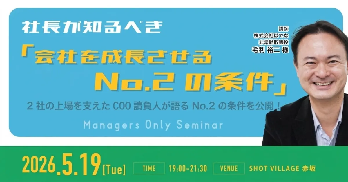 2026年5月19日、東京都港区赤坂にて、経営者コミュニティ「参謀」を運営する株式会社経営参謀が主催する勉強会が開催されます。このイベントでは、株式会社はてなと株式会社アイレップの2社の上場を成功に導いた“COO請負人”毛利裕二氏が、会社を成長させるための「No.2」の条件について詳しく解説します。