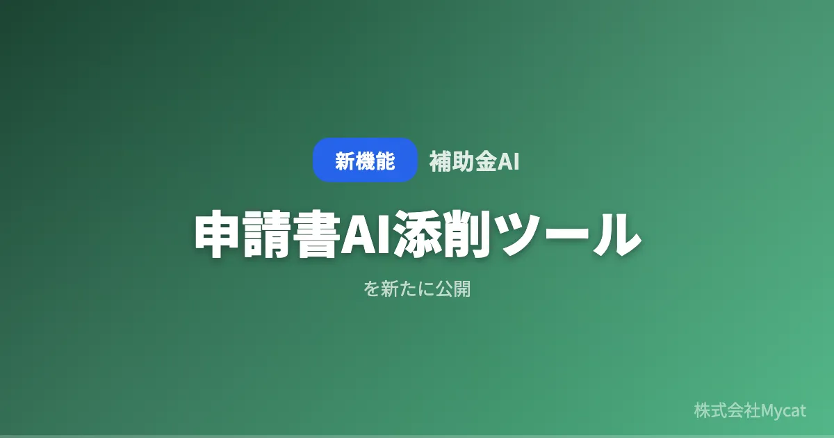 株式会社Mycatが、事業計画書の添削を行う「AI添削ツール」を新たに公開しました。このツールは、事業計画書の記述を匿名で入力することで、特定の補助金の採択基準に基づいた改善提案を素早く受け取れる画期的なサービスです。詳細は