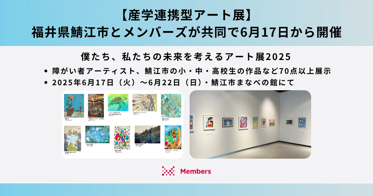 福井県鯖江市で、株式会社メンバーズと地元高等学校の学生たちが共に創り上げるアート展が、2025年6月17日から6月22日までの期間に実施されます。本展では、障がい者アーティスト社員が手がけた42作品と、鯖江市内の小・中・高校生による30点以上の作品が展示される予定です。
