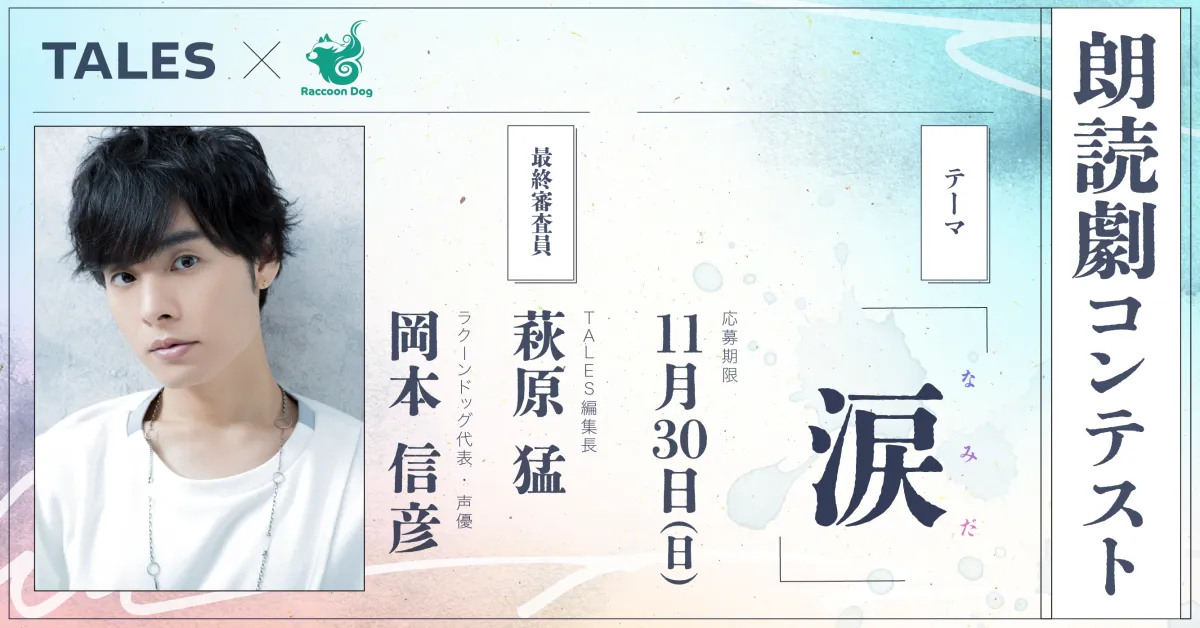 このコンテストは10月1日から11月30日まで参加を受け付けており、テーマは「涙」。このテーマに基づいた10,000字程度のオリジナル作品を募ります。審査を経て選ばれた作品は、プロの脚本家にリライトされ、来春にはロードキャストを行う予定です。岡本氏含むラクーンドッグの声優陣による劇の展開により、投稿者には特別な機会が用意されています。