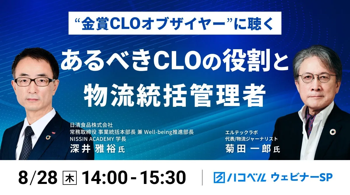 2025年8月28日(木)、物流プラットフォームを提供するハコベル株式会社が、特別なウェビナーを開催します。このウェビナーでは、日清食品株式会社の常務取締役である深井雅裕氏を招き、「CLO(チーフ・ロジスティクス・オフィサー)」の実際の役割と、物流改革についての貴重な知見を提供していただきます。