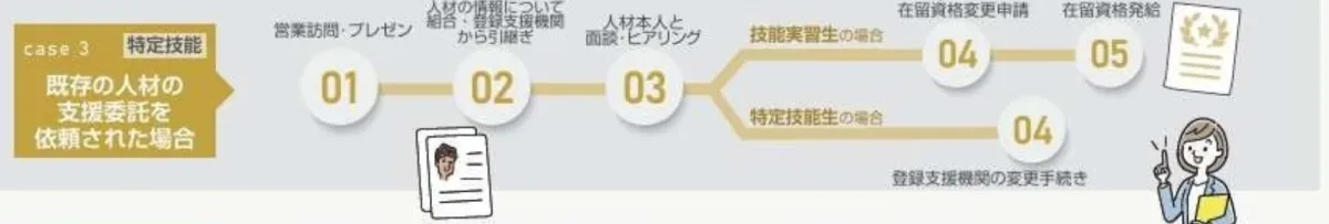 技能実習を経た外国人を特定技能に移行させるサポートも実施します。特定技能は通常、技能実習よりも管理費用が低く抑えられるため、企業にとっては経済的なメリットとなります。