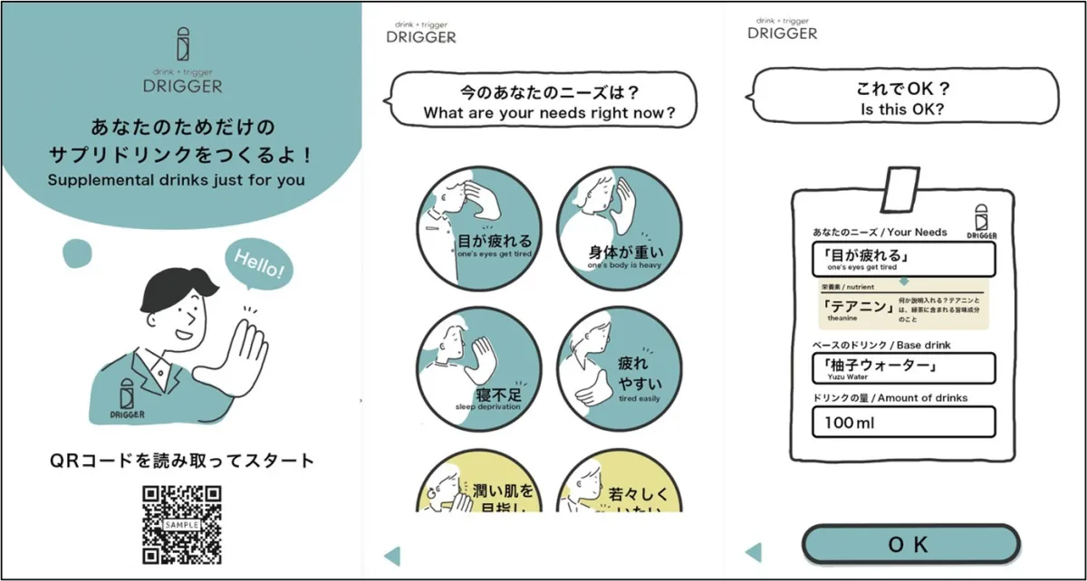 「DRIGGER」は、利用者が自身の健康状態を反映させたリクエストを行うことで、タッチディスプレイを通じ神自らの意思で飲料を選べる仕組みとなっています。具体的には、「疲れやすいかな?」や「若々しくいたい」といった利用者の要望に対して、飲み物の種類や量をカスタマイズすることができるため、まさにパーソナライズされた体験が楽しめます。この様々なニーズに応える機能が、日常の業務をこなすオフィスワーカーの活力を引き出す手助けとなるでしょう。