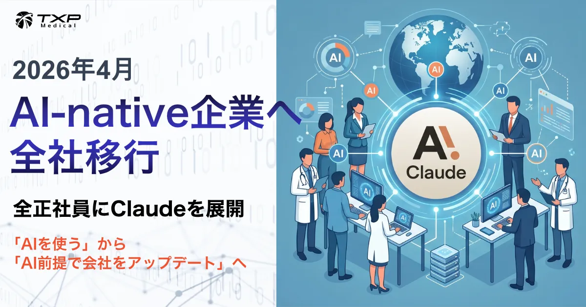 2026年4月、TXP Medical株式会社(本社:東京都千代田区、代表取締役CEO:園生 智弘)は、Anthropic社の生成AI「Claude」を全正社員に導入することを発表しました。この取り組みは、TXP MedicalがAI-native企業に生まれ変わるための第一歩です。