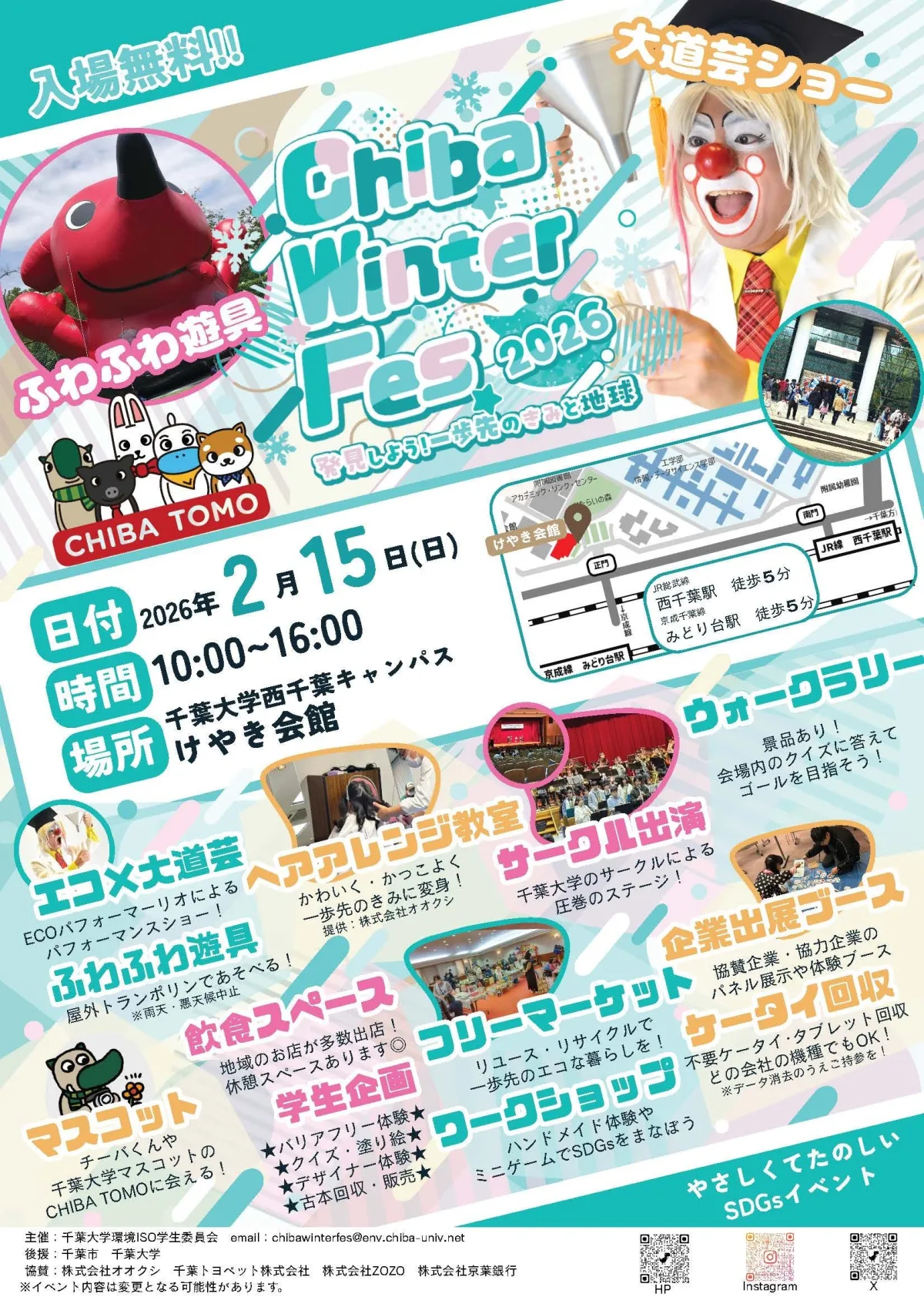 今年のイベントでは、多彩なアクティビティが予定されています。特に注目すべきは、ECOパフォーマーのリオによる大道芸パフォーマンス「3つのRを学ぶ ECOパフォーマンスショー」や、千葉大学のゆるキャラ「CHIBA TOMO」や「チーバくん」が登場するマスコット大集合です!