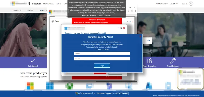 2023年から続くサポート詐欺の増加は、特に2024年になって顕著になりました。この種類の詐欺は、ユーザーに偽の警告画面を表示させ、あたかもその端末がウイルスに感染したかのように不安を煽ります。警告には、日本語や英語でのアナウンスが含まれ、特にWindows環境では全画面表示になり、操作を困難にします。こうした手口で不安を引き出し、提供されるサポート窓口に連絡させ、金銭を要求したり、悪意のあるソフトをインストールさせるケースが多発しています。