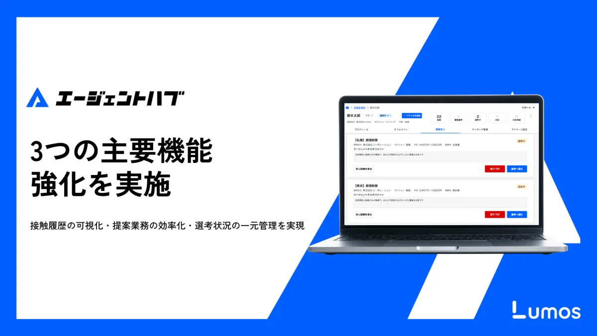 人材業界において、エージェントの役割は言うまでもなく重要です。そのエージェントの業務を支えるシステム、「エージェントハブ」を運営する株式会社Lumosが、自社の製品に新たな機能強化を実施しました。これにより、業務効率化と情報共有が一層促進され、求職者への提案業務がさらにスピーディーかつ正確になることが期待されます。