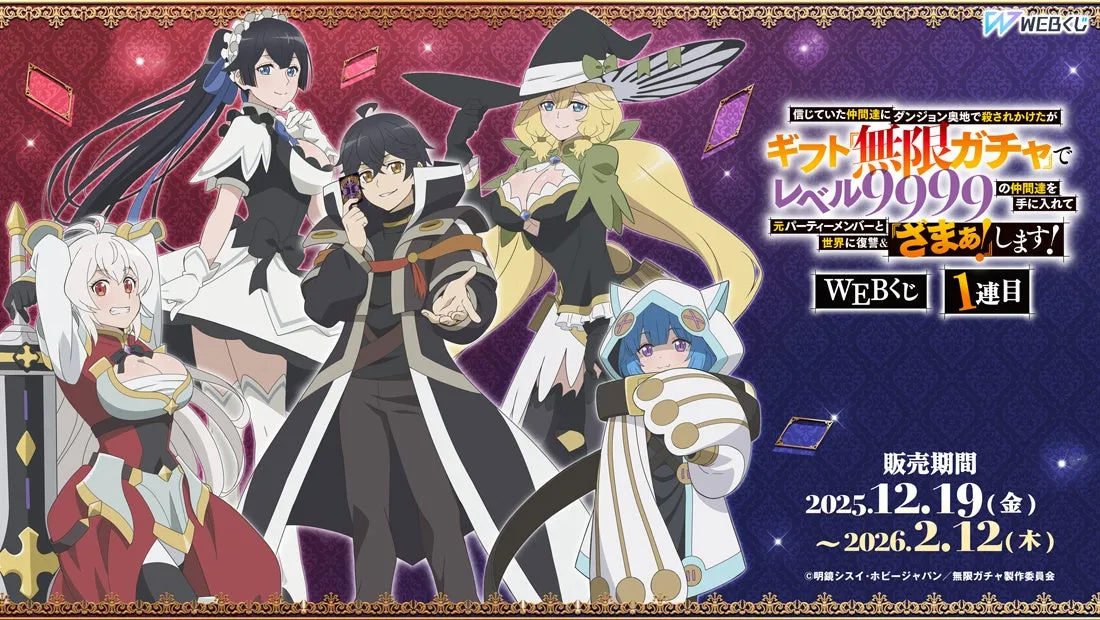 2025年12月19日、株式会社ディ・テクノが新たなオンラインくじ「『無限ガチャ』WEBくじ1連目」の販売を開始しました。このくじは、人気TVアニメ『信じていた仲間達にダンジョン奥地で殺されかけたがギフト『無限ガチャ』でレベル9999の仲間達を手に入れて元パーティーメンバーと世界に復讐&『ざまぁ!』します!』の新規描き下ろしイラストを使用した豊富なグッズが揃っている、ドキドキのハズレなしオンラインくじです。