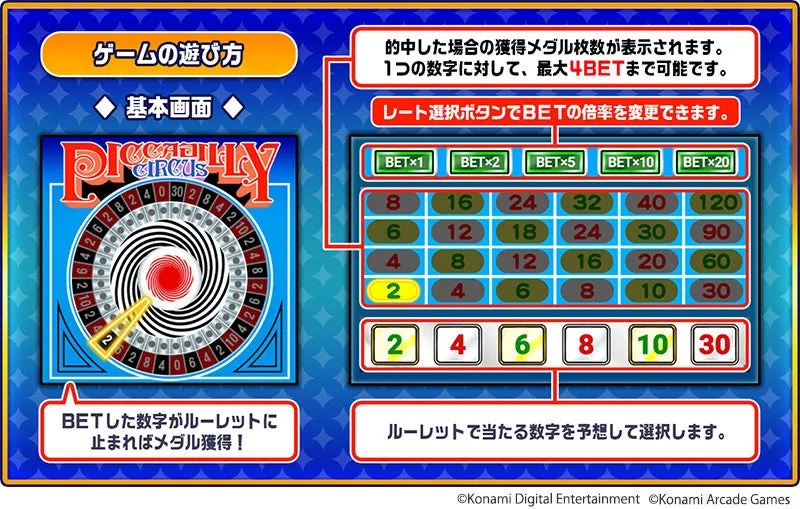 プレイヤーは、ルーレットで当たる数字を予想し、最大4枚のメダルをBETできます。当たれば獲得するメダルの枚数が倍増する仕組みで、スリリングな展開が楽しめます。また、レート選択ボタンを活用すれば、最大20倍のレートでプレイが可能。これにより、戦略を練りながらプレイする楽しみが一層広がります。