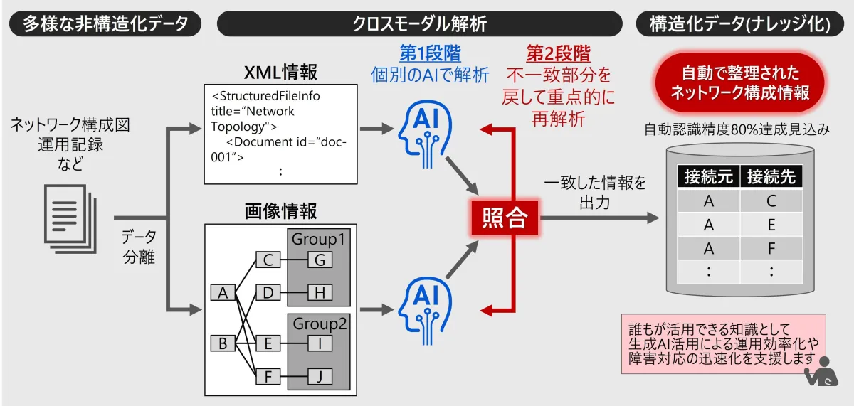 通信業界では、ネットワーク構成図やトラブル対応の記録といった、決まった形式を持たないデータが多数存在します。これらはスライド形式のファイルやテキスト情報として保存されており、非常に多様です。非構造化データは、必要な情報をすぐに取り出すことが難しいため、障害を特定したり業務を自動化したりする上でハードルとなっていました。