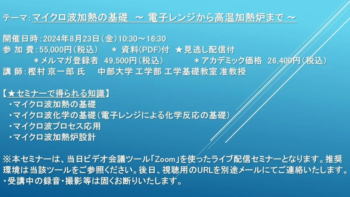 先端技術情報や市場動向を提供している(株)シーエムシー・リサーチが、2024年8月23日(金)に「マイクロ波加熱の基礎~電子レンジから高温加熱炉まで~」と題したライブ配信セミナーを開催します。本セミナーでは、マイクロ波加熱技術に関する基本的な知識から応用まで、幅広い内容が網羅されます。講師には中部大学の樫村京一郎准教授をお迎えし、オンラインでの参加が可能です。