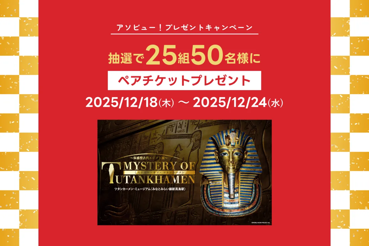 アソビュー株式会社は、2025年12月18日(木)から「MYSTERY OF TUTANKHAMEN 体感型古代エジプト展」のペアチケットを抽選で25組50名にプレゼントするキャンペーンを開始します。この機会に、エジプトの歴史に触れ合う貴重な体験をお楽しみください。