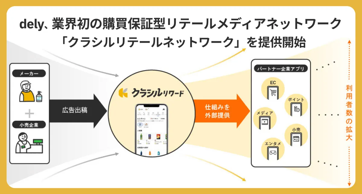 2025年8月から、dely株式会社が業界初の試みとして、複数の消費者向けアプリに販促案件を横断配信する"クラシルリテールネットワーク"を開始します。これは、食品メーカーや小売企業との長年の関係を活かし、生活者接点を一元化するプラットフォームです。