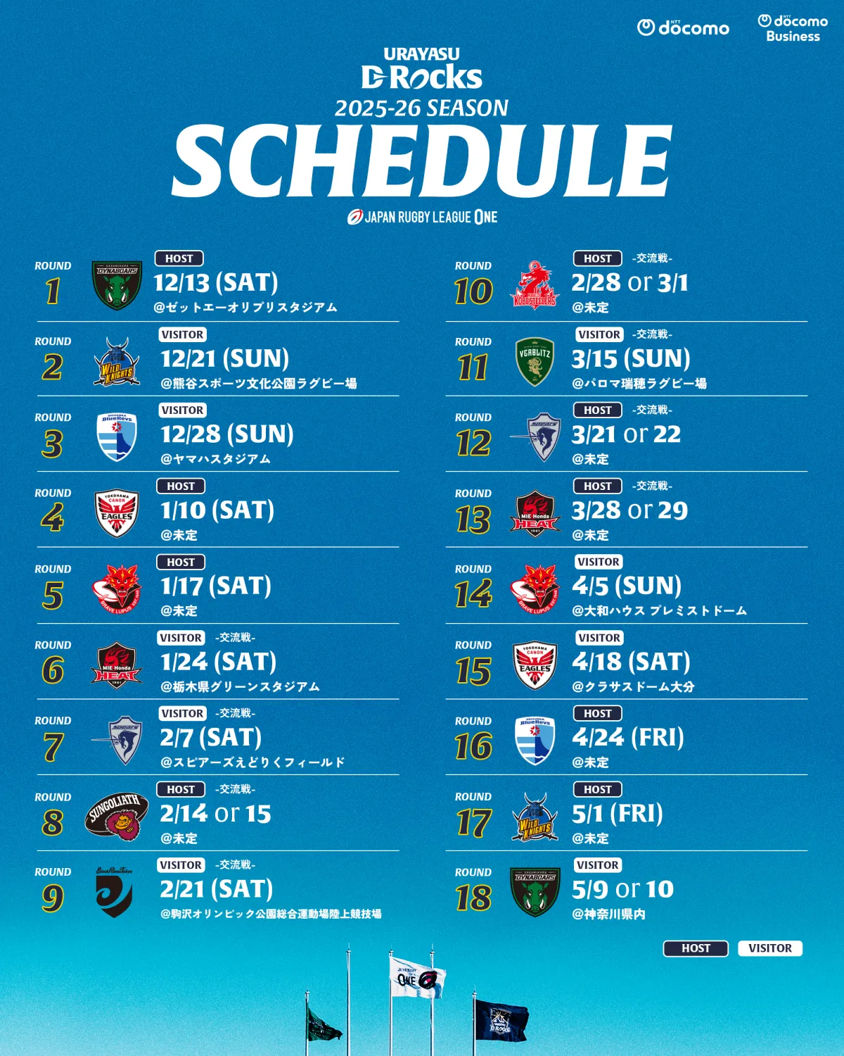 浦安D-Rocksからファンの皆さんへ、2025-26シーズンのNTT JAPAN RUGBY LEAGUE ONE DIVISION 1の試合日程が正式に発表されたことをお知らせします。いつも温かいご声援をいただき、心より感謝申し上げます。