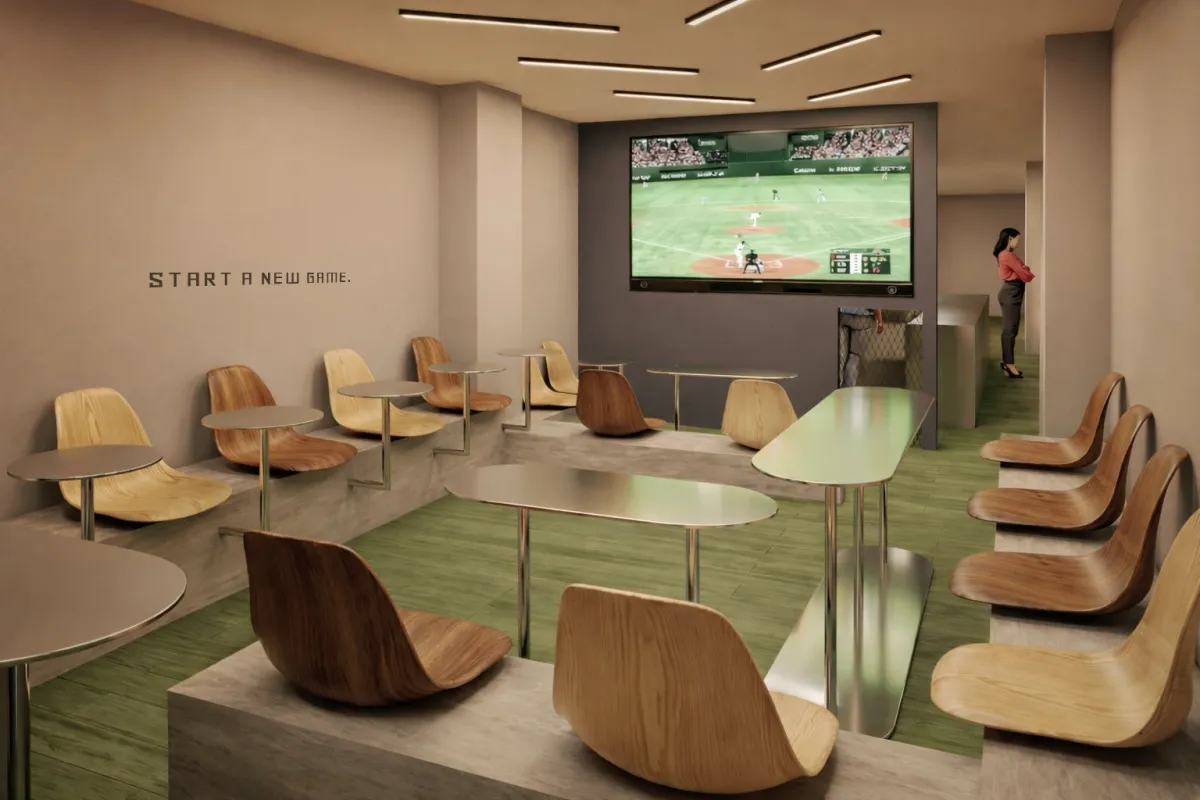窗に任せられたデザインにより、スタジアムのダイナミズムを表現した内装は、日常生活においてもその興奮を楽しむ新たなスポットとなることでしょう。