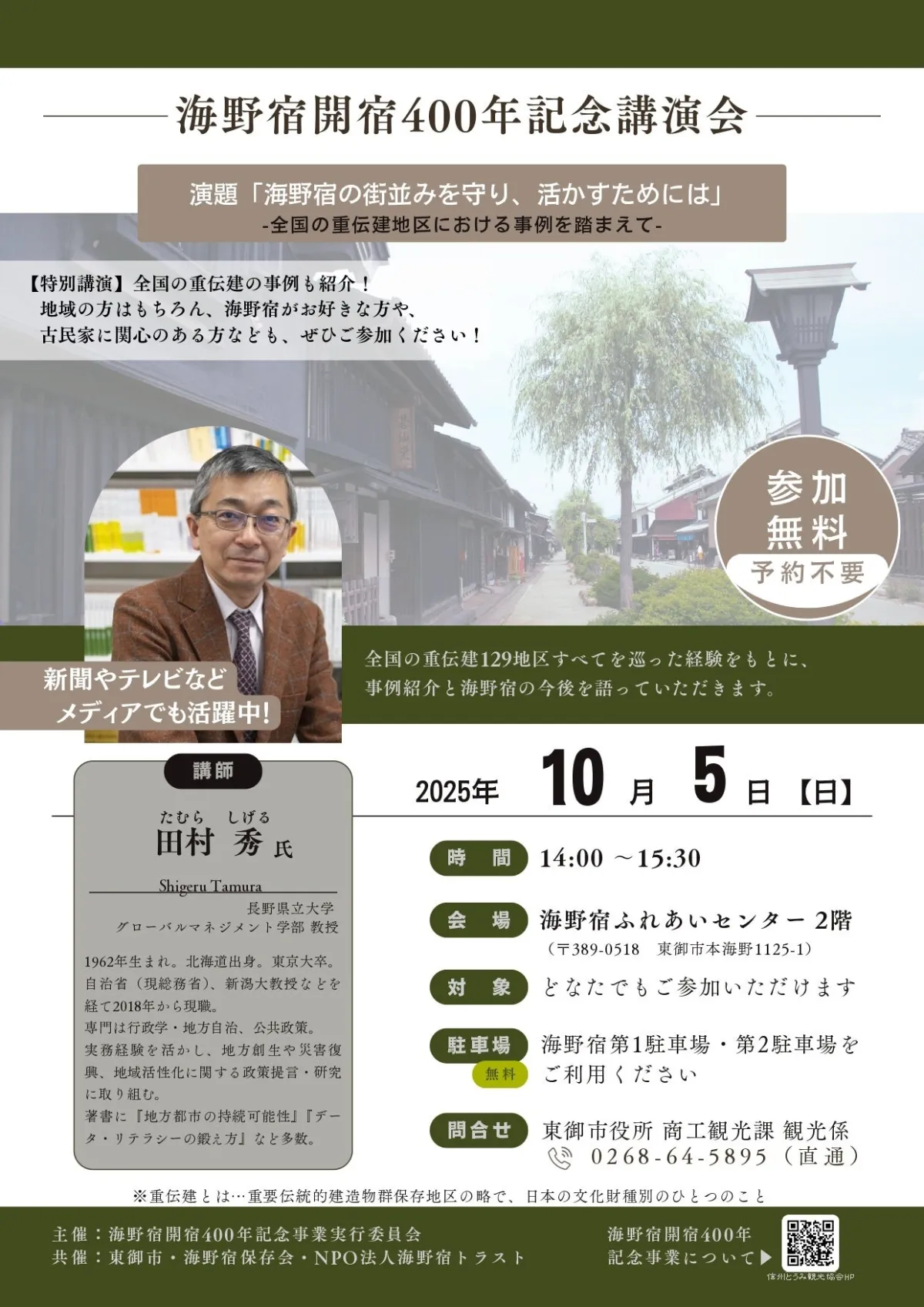 田村教授のタイトルは「海野宿の街並みを守り、活かすためには」。この講演では、地域の文化や歴史を大切にしながら、どのようにして現代社会にマッチした活用法を見つけられるかについて、深く掘り下げていく予定です。特に、参加者が自らの視点で新しいアイデアを生み出すきっかけとなるような内容が期待されています。