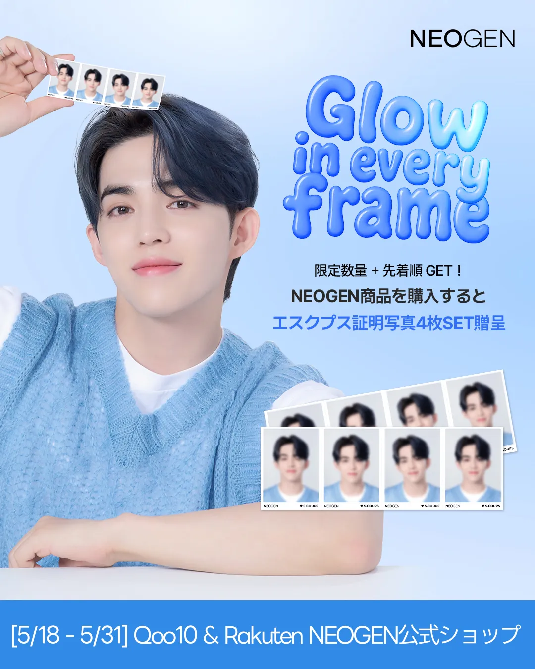 韓国の人気バイオコスメブランドNEOGEN(ネオゼン)が、待望のプレゼントキャンペーン「Glow in Every Frame」をスタートしました。このキャンペーンでは、ブランドのモデルであるSEVENTEENのS.COUPSの証明写真が、一定金額以上の購入者にプレゼントされる特別企画です。日本国内のみならず、アメリカ、ベトナム、中国など、グローバルに展開されているため、ファンには必見の内容となっています。