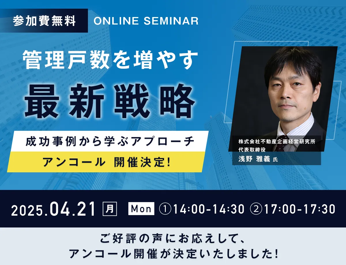 宮崎県の不動産テック企業、日本情報クリエイトが2025年4月21日(月)に、無料オンラインセミナー「管理戸数を増やす最新戦略 ~成功事例から学ぶアプローチ~」を開催することが決まりました。これは昨年、大好評を博したウェビナーのアンコール開催です。