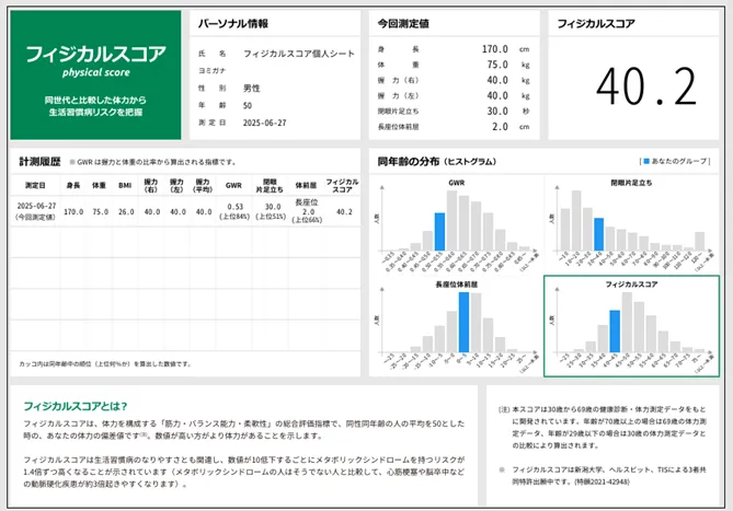 この健康指標は、新潟大学、TIS株式会社、ヘルスビットの共同研究によって開発され、特許も取得されています。フィジカルスコアは偏差値の形式で提供され、同じ年齢・性別の平均を「50」として設定し、簡単に自身の体力を理解できるようになっています。特に注目すべきは、フィジカルスコアによって生活習慣病リスクが科学的に明らかにされる点です。