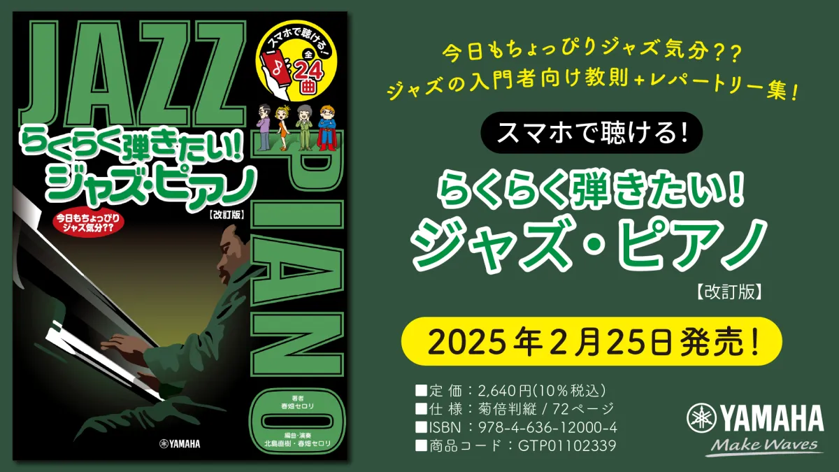 2025年2月25日、株式会社ヤマハミュージックエンタテインメントホールディングスから「スマホで聴ける!らくらく弾きたい!ジャズ・ピアノ【改訂版】」がリリースされます。この書籍は、2008年からのロングセラーであり、初心者でも楽しくジャズを学べる教則本とレパートリー集が一つになっています。