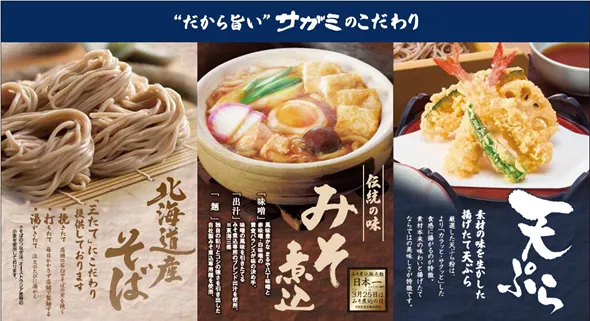 サガミでは、毎日店内で北海道産のそばを挽き、製麺し、注文ごとに湯がいています。この手法により、香り豊かなそばが楽しめます。また、サガミ満天そばに使用される韃靼そばは、有機栽培で育てられ、苦みが少なく風味も抜群です。お客様に「健康でおいしい食事」を提供することを第一に考えています。