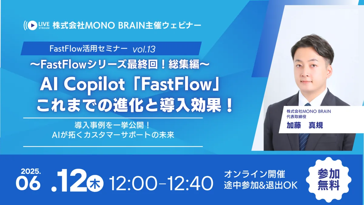 2025年6月12日(木)12時から、カスタマーサポート(CS)に特化したAIソリューションを提供する株式会社MONO BRAINが、オンラインウェビナー「AI Copilot『FastFlow』シリーズ最終回!総集編ウェビナー (vol.13)」を開催します。このウェビナーは、これまでに12回にわたりおこなってきたシリーズの集大成ともいえるもので、参加者にとって貴重な情報が提供されることでしょう。
