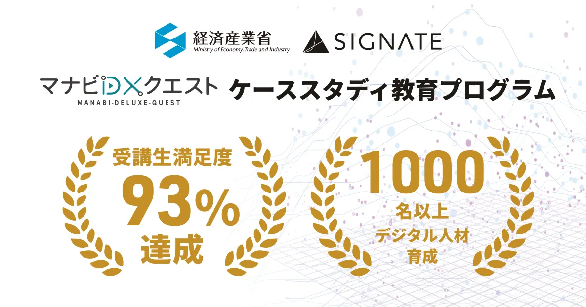 株式会社SIGNATEは、経済産業省のデジタル人材育成事業「マナビDX Quest」に参加し、ケーススタディ教育プログラムを通じて1,000人以上のデジタル人材を育成しました。このプログラムの参加者満足度は驚異の93%を達成しています。デジタル技術の重要性が増す中、企業や学生が必要なスキルを身につけることができるこのプログラムが注目されています。