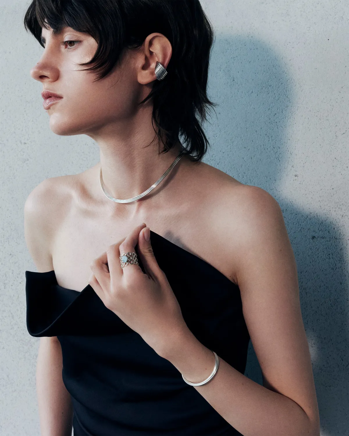 今回取り扱われるのは、チョーカー(¥51,700)、イヤーカフ(¥27,500)、バングル(¥24,200)、そして新作のリング(¥41,800、ミルキーアクアマリン)です。これらのアイテムは、細身の甲丸線をリンクさせた形が特徴で、重ねて装着することで、より一層の美しさを演出します。本コレクションの目玉は「MAILS(メイルズ)」シリーズの多連リングで、ここでは15連リング(¥49,500)と6連リング(¥29,700)の2タイプが展開されます。