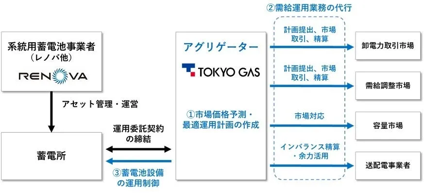 東京ガス株式会社が、新たに系統用蓄電池の最適運用サービスを立ち上げ、その初号案件として、株式会社レノバが開発した2か所、合計165MWの蓄電所の需給運用業務を受託しました。この取り組みは2028年度から20年以上にわたって続く見込みで、電力市場のさまざまな動向に柔軟に対応し、複数の市場での活用を目的としたものです。
