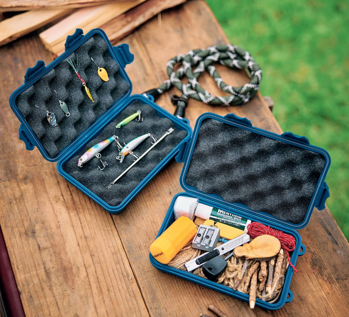 このケースは、縦10.5cm、横16.5cm、高さ5cmのコンパクトなサイズで、使い勝手を考えたデザインが特徴です。中にはクッションが施されており、両面、片面、またはクッションなしと、収納する道具のサイズに応じて調整できるため、火おこしセットや釣り道具など、多種多様なアイテムを安心して収納できます。