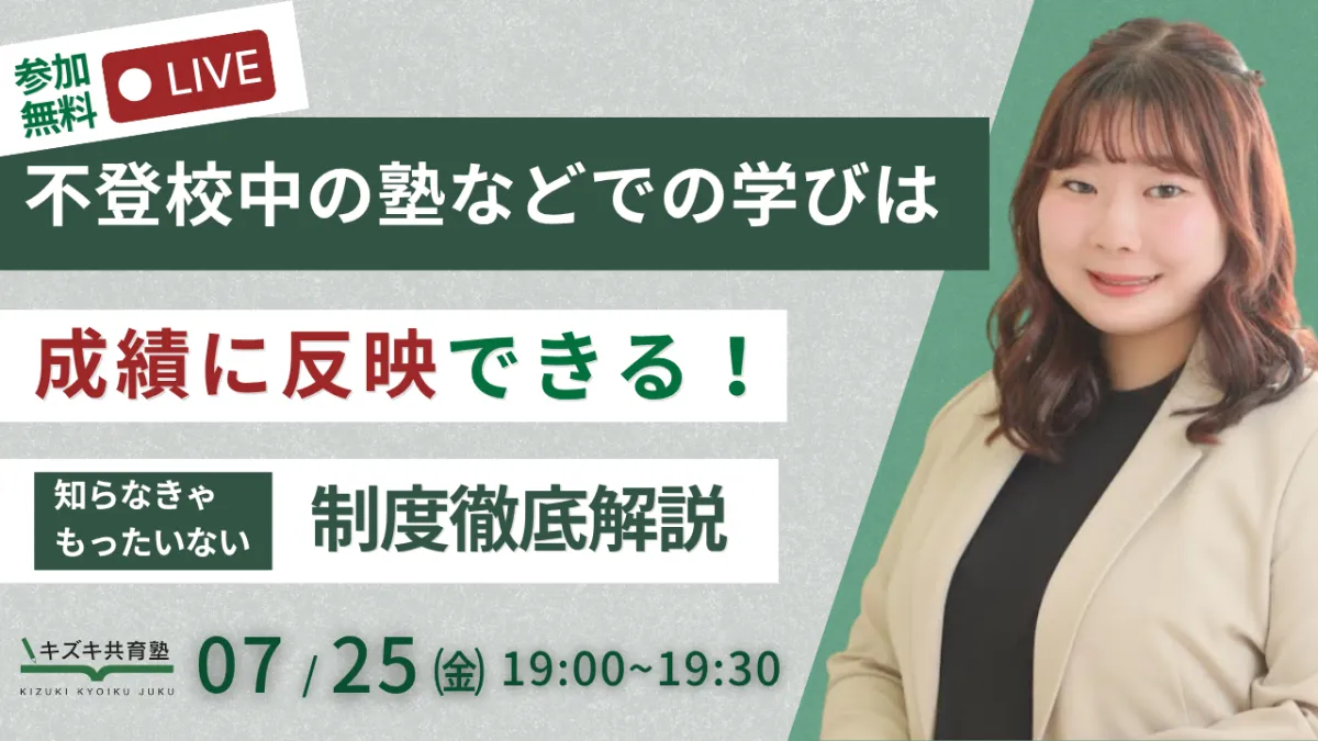 2025年7月25日、キズキ共育塾では、不登校の子どもを持つ保護者を対象にした無料オンラインイベントが開催されます。このイベントでは、塾やフリースクール、自宅での学びが学校の通知表や出席日数にどのように反映されるかについて詳しく説明されます。