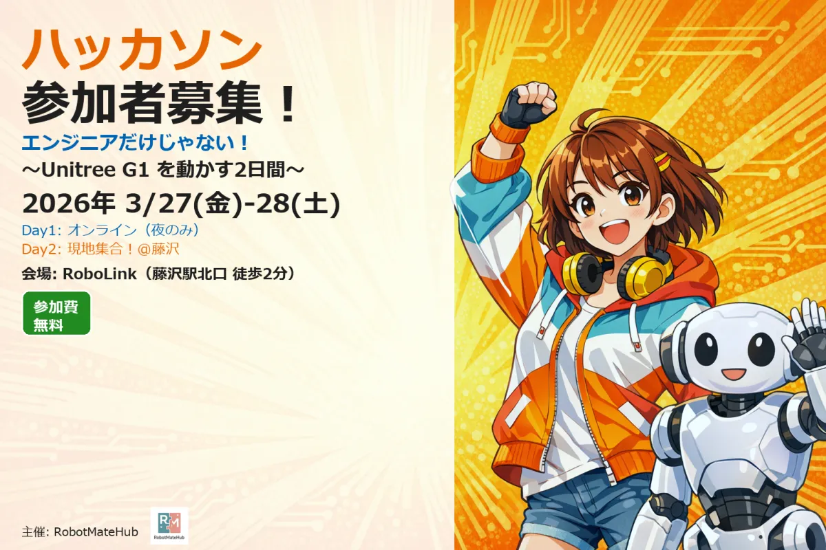 2026年3月27日(金)・28日(土)、神奈川県藤沢市のロボット企業交流拠点「ロボリンク」にて、日本初となるヒューマノイドロボット「Unitree G1」を使用したPhysical AIハッカソンが開催されます。このイベントは、さまざまな職業・バックグラウンドを持つ参加者が集まり、「人とロボットの共生社会」というテーマのもと、アイデアを競う貴重な機会を提供します。参加は無料。応募締切は2026年3月15日ですので、興味がある方は早めに申し込みを!