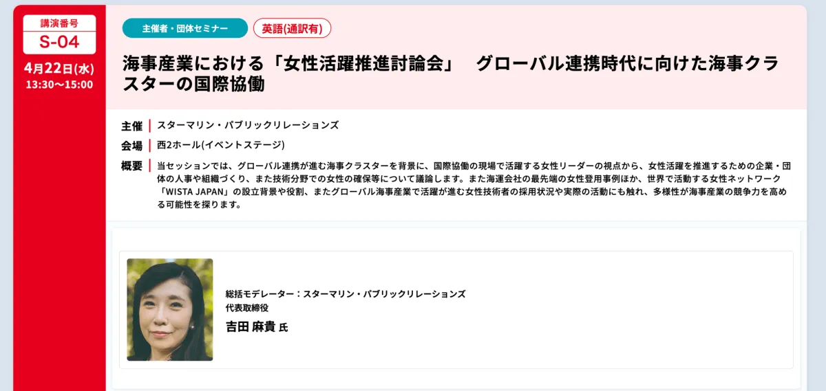 海事産業における女性の活躍を更に推進するため、ぜひ多くの方々の参加をお待ちしています。