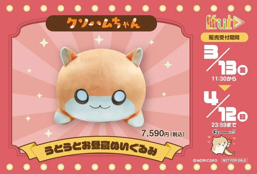 商品名は『うとうとお昼寝ぬいぐるみ』。これは、うつ伏せの姿勢で寝ているハムスターの姿を再現した癒し系のアイテムです。昨年度には「コビハムちゃん」というバージョンも好評を博しており、そのクソハムちゃん版としてのリリースに期待が集まっています。なお、同時にコビハムちゃんのぬいぐるみも再受注されるため、両方を手に入れるチャンスです。