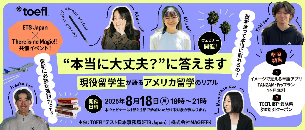 このウェビナーは、TOEFLテスト日本事務局と株式会社MAGEEEKが共催するイベントです。英語学習や留学に関心がある方々に最適な情報を届け、彼らがより安心して留学の一歩を踏み出せる手助けをしています。皆さまの参加を心よりお待ちしています!