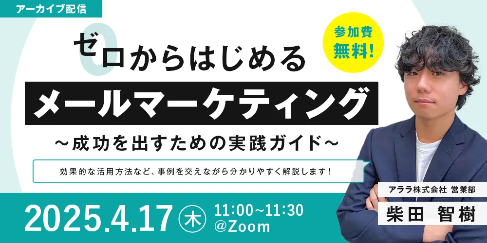 企業の収益向上を目指す現代において、メールマーケティングは重要な施策として注目されています。特に新年度を迎える4月は、多くの企業が新しい挑戦や戦略の見直しを行う時期となります。そんな中、アララ株式会社は、メールマーケティングに関する無料Webセミナー「ゼロからはじめるメールマーケティング~成果を出すための実践ガイド~」のアーカイブ配信を2025年4月17日(木)に実施することを発表しました。