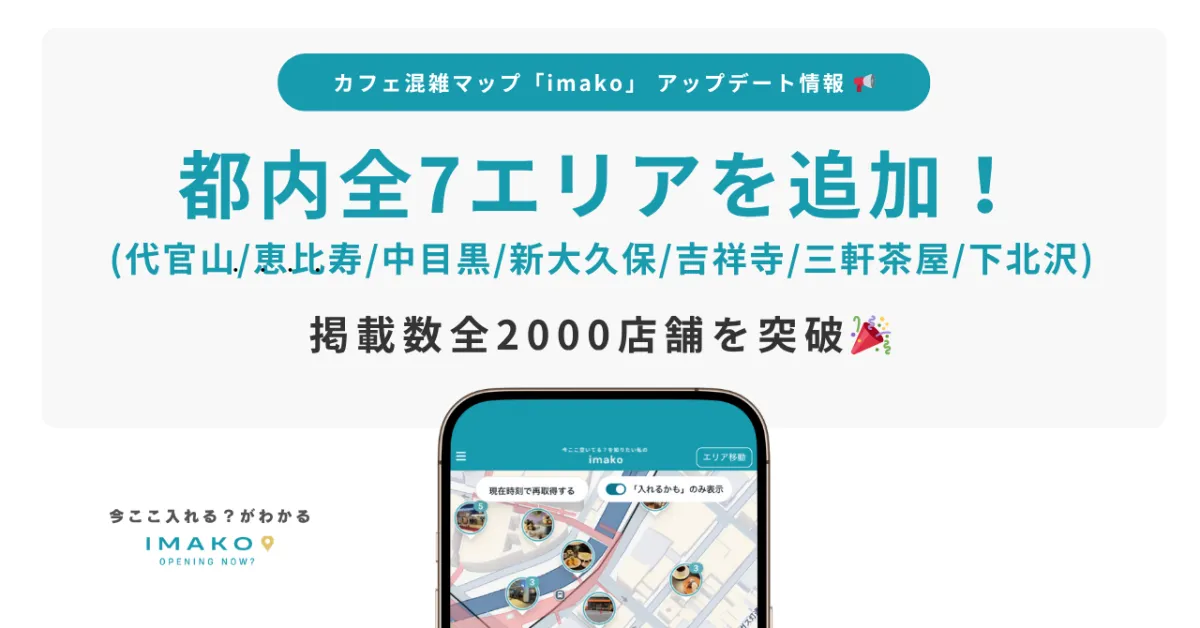 株式会社imakoが運営するカフェ混雑情報マップ「imako」は、最近代官山、恵比寿、中目黒、新大久保、吉祥寺、三軒茶屋、下北沢の7つの人気エリアを新たに追加しました。これにより、同サービスの掲載店舗数は2,000を超え、カフェ混雑情報の提供がさらに充実しました。