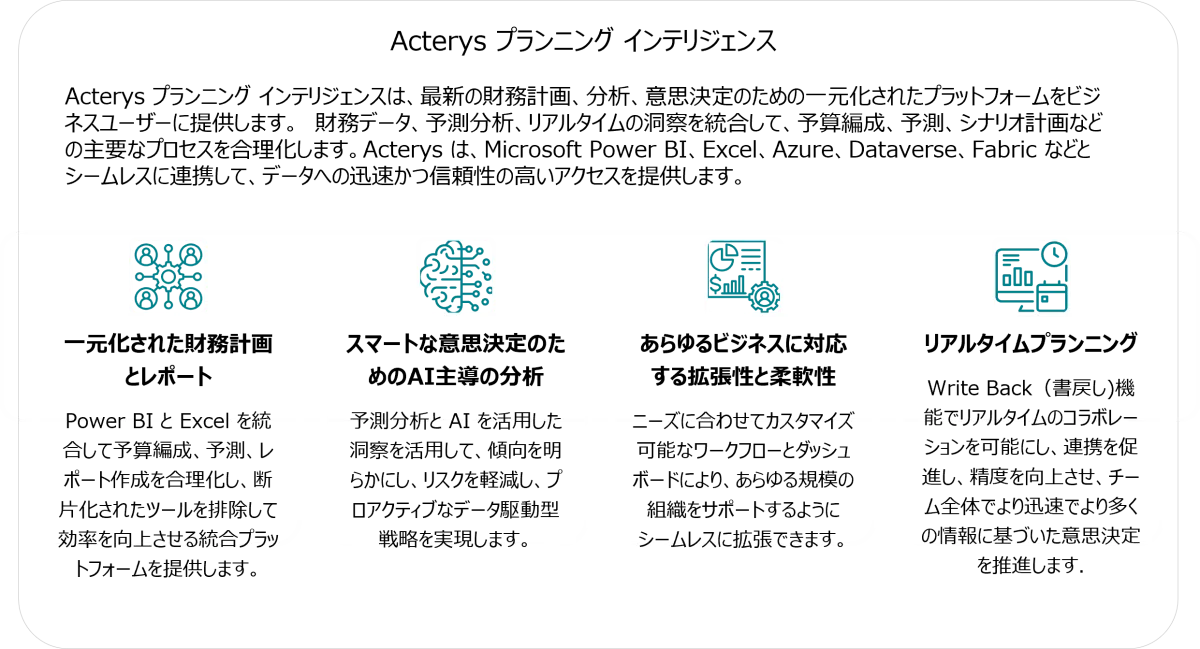 Acterysは、データをビジネス行動に変えるための新しいソフトウェアアプローチを提供します。強力かつシームレスなライトバック機能とワークフロー機能が企業のデータ統合をサポートし、より迅速にスマートなAI対応ソリューションを構築することができるのです。また、CFOオフィス向けには予算編成や計画を統合する集中型プラットフォームが用意されています。