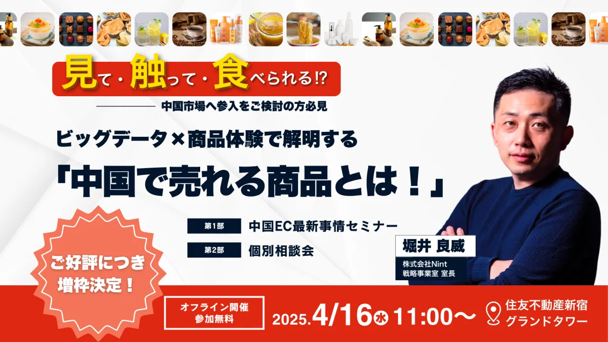 株式会社Nintは、2025年4月16日(水)に東京都新宿区でオフラインイベント「中国市場の今がわかるビッグデータ解析×商品体験ワークショップ」を開催します。本イベントは、中国EC市場に関心を持つ企業やマーケティング担当者に向けて設計されています。具体的には、リアルな消費者ニーズやヒット商品について、データと実物体験を通じて理解を深めることができます。