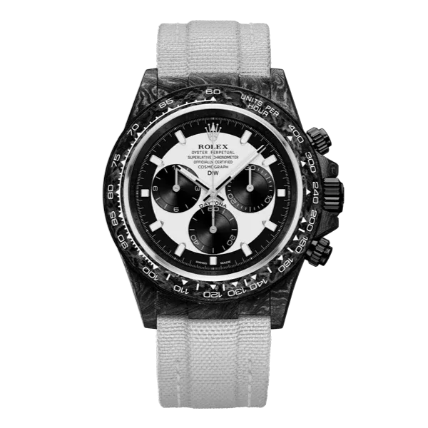 「CARBON ROLEX DAYTONA Cream」は、特徴的なブラックカーボンケースとホワイトダイヤル、スモーキーホワイトのストラップが絶妙に融合したデザインです。この配色はシンプルでありながら、力強く洗練された印象を与え、どんなスタイルにもぴったり合います。特に、手首に装着した際の存在感は抜群で、どんなシーンでも際立つことでしょう。