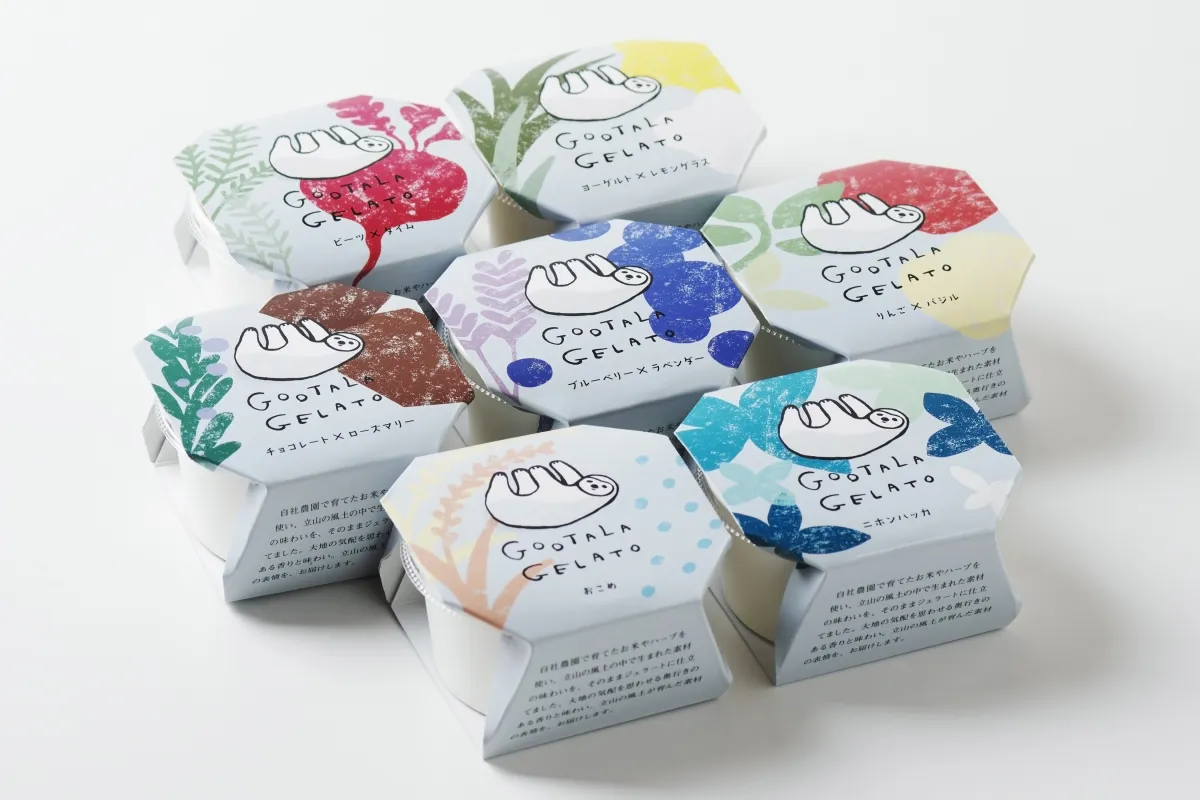 GOOTALAから発売された第一弾商品「ぐーたらジェラート」は、自社で栽培した無農薬のハーブやお米を使用した実にこだわりのある一品です。大手シェフ、増山明弘氏がレシピ開発を監修し、素材本来の味を大切にした美味しさを追求しています。おいしさだけでなく、見た目にも美しいこのジェラートは、ご自宅用はもちろん、贈り物としても喜ばれることでしょう。