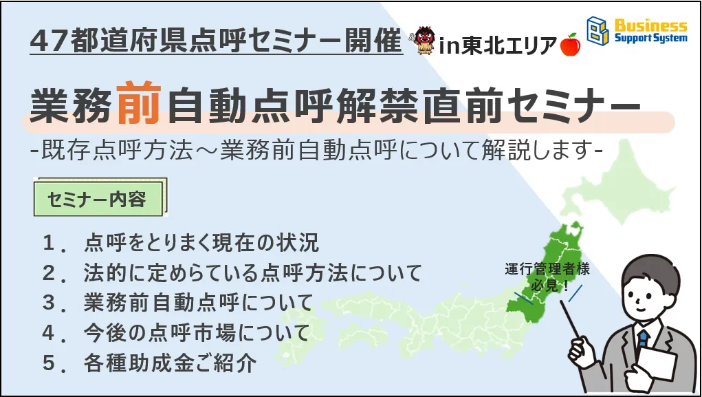 本セミナーでは、業務前自動点呼についての最新情報を中心に、遠隔や自動点呼の申請要件、助成金制度などを詳しく説明いたします。解禁日は令和7年5月上旬が有力であり、このタイミングでの参加は貴重な情報収集の機会となるでしょう。