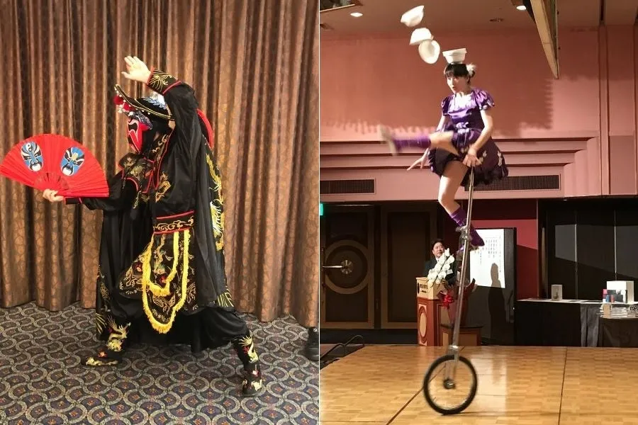 ディナーが進む中、19時からは壮大なエンターテイメントショーが始まります。中国雑技を披露するのは、常玉星(ジョウ・ギョクセイ)氏と張磊(チョウライ)氏の2名。彼らは目にもとまらぬ変面技術や、緊迫感あふれるパフォーマンスで会場を盛り上げます。食事とともに彼らの華やかな演技を観賞できる贅沢なひととき。これこそが、ゴールデンウィークの特別感を演出する要素です。