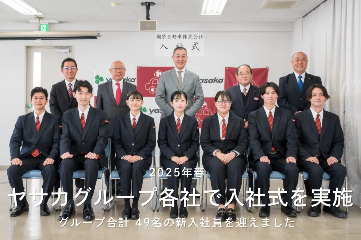 2025年度の春、ヤサカグループの各社にて入社式が行われ、新たに49名の新入社員が加わりました。グループの中心となる彌榮自動車株式会社では、3月31日に7名の新卒プロフェッショナルドライバーを迎え、社長の粂田氏からの温かいメッセージが伝えられました。