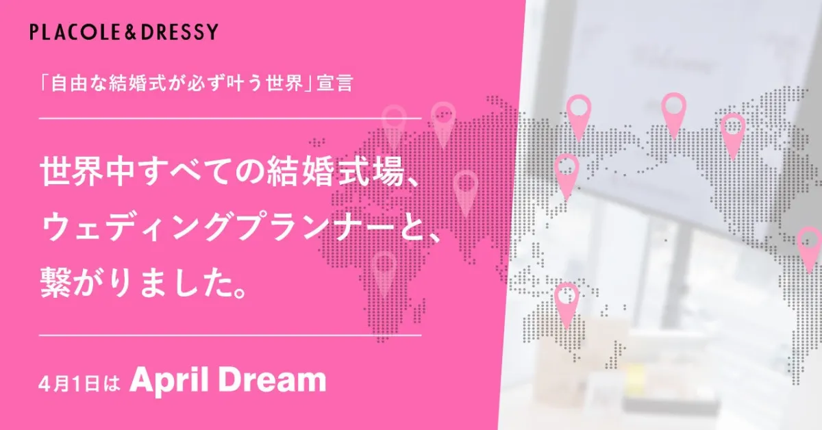 本日の4月1日、プラコレは「エイプリルフール宣言」として新たな展望を発表しました。「世界中すべての式場・プランナーと繋がる」というビジョンは、現時点では夢の話ですが、自由な結婚式を提供したいという意志は揺るぎありません。結婚式が他のカップルの希望を生む、その循環を信じて、プラコレは今後も挑戦を続けます。