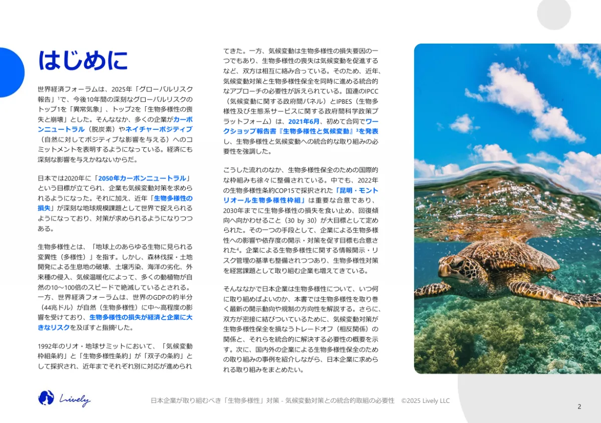 Lively合同会社が、新たに公開したレポート「生物多様性とサステナビリティ経営:最新開示基準と先進企業の戦略に学ぶ」について、本記事で詳しくお伝えします。このレポートは、企業が未来に向けてのビジョンを築くための重要な指南書となるでしょう。