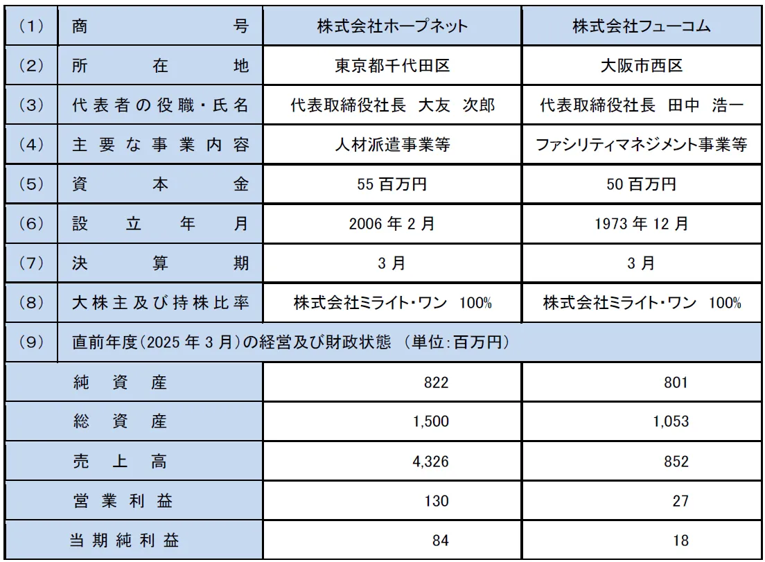 合併に関する取締役会は2025年6月6日に行われ、その際に株式会社ホープネットが存続会社、株式会社フューコムが消滅会社として吸収合併を行うことが決議されました。この合併は、2025年10月1日を効力発生日として実施される予定です。