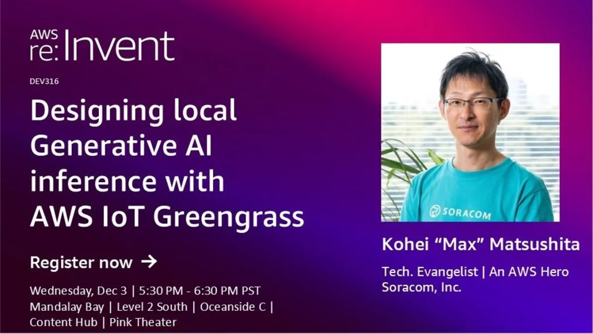 松下エバンジェリストは、「AWS IoT Greengrass」を使用したエッジAIのセッションで登壇します。タイトルは「Designing local Generative AI inference with AWS IoT Greengrass」で、12月3日17:30から18:30まで行われます。このセッションでは、クラウド上での生成AIの推論だけでなく、ローカルでの実行の必要性についても掘り下げられます。