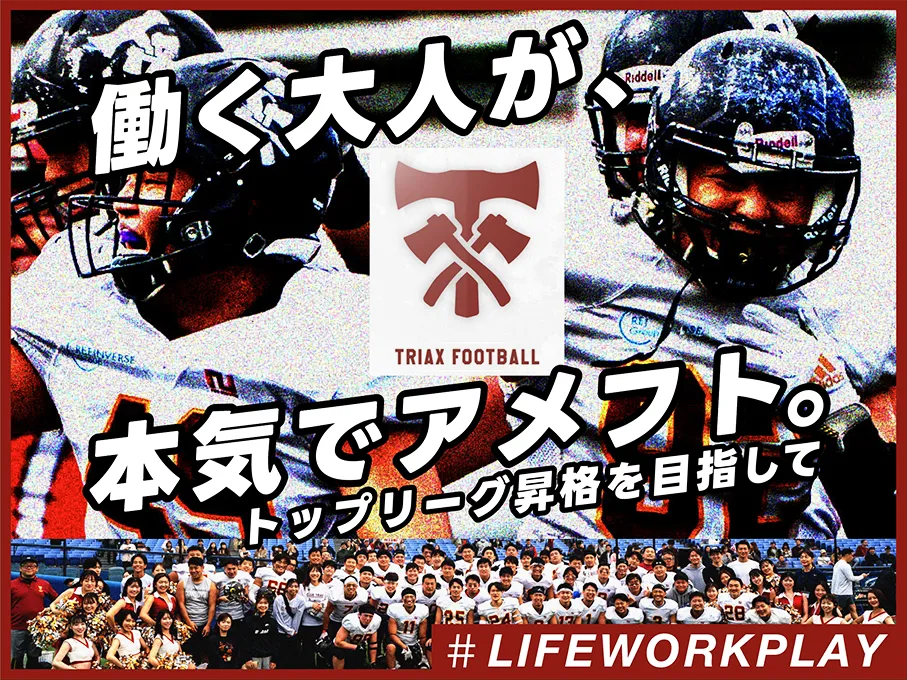 Club TRIAXは、Xリーグ X1 AREAに属し、チームの理念として「LIFE(生活・家庭)、WORK(仕事)、PLAY(トライアックスでの活動)」を掲げています。今年は創部25周年を迎え、さらなる高みを目指すために「COMMIT」をスローガンに掲げています。