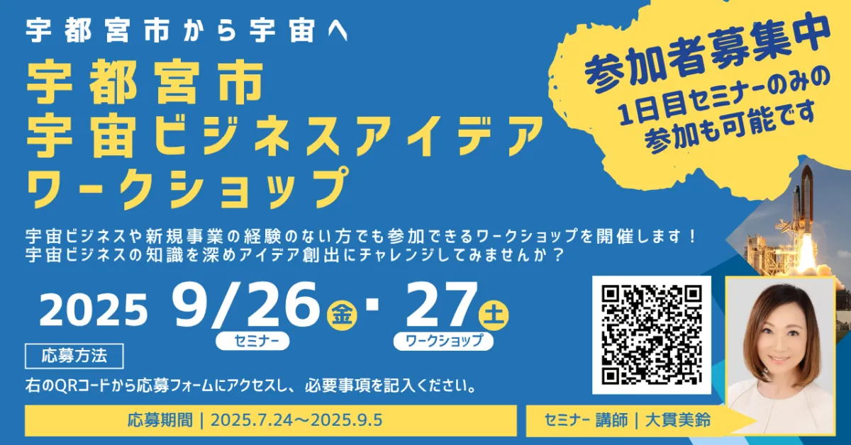 本イベントは、株式会社amulapo(アミュラポ)が運営し、宇都宮市より委託を受けています。参加者は、宇宙ビジネスに関する基本知識を学ぶ講演や、実際に地域でビジネス創出経験を持つ講師によるワークショップを通じて、宇宙関連の知識を深めることができます。若手起業家や新たなビジネスに興味を持つ皆さんのご参加をお待ちしています。